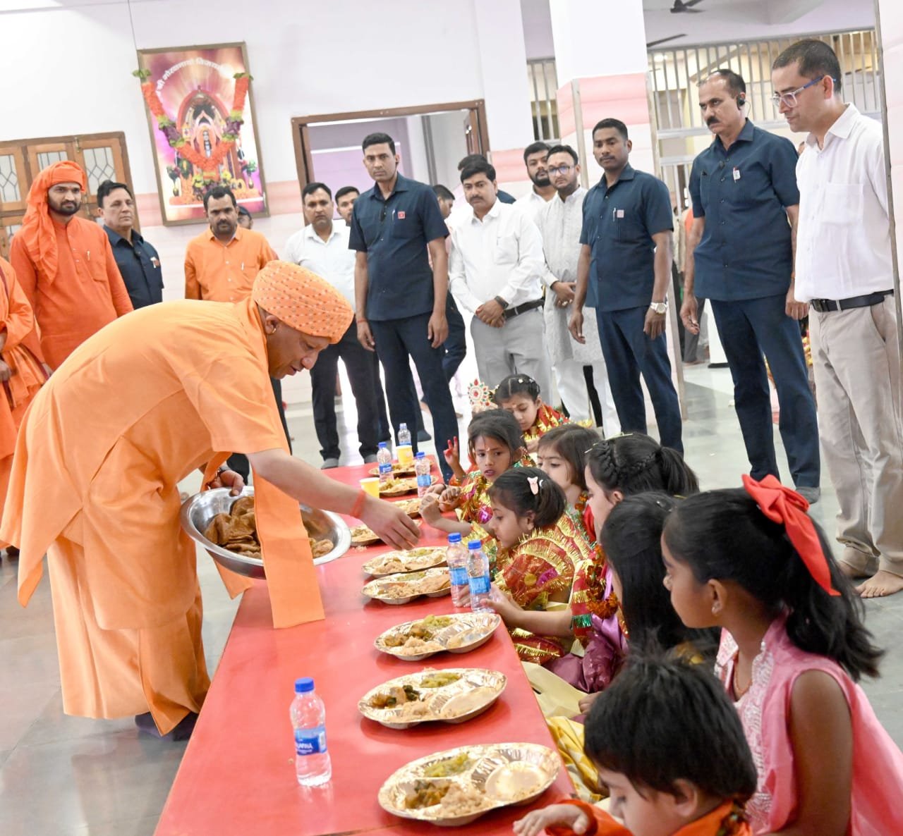 गोरक्षपीठाधीश्वर ने सबसे पहले कन्याओं के पांव पखारे। उनके माथे पर रोली, चंदन, अक्षत आदि का तिलक लगाया। दुर्वा से उनका अभिषेक किया, माला पहनाई। चुनरी ओढ़ाकर एवं दक्षिणा-उपहार प्रदान कर आशीर्वाद लिया। उन्होंने अन्न क्षेत्र में सभी कन्याओं व बटुकों की श्रद्धाभाव से आरती भी उतारी। पूजन के बाद इन कन्याओं को मंदिर की रसोई में पकाया गया ताजा भोजन प्रसाद मुख्यमंत्री योगी आदित्यनाथ ने अपने हाथों से परोसा। आयोजन में आईं सभी कन्याओं को पूजनोपरांत चुनरी, दक्षिणा और उपहार दिए गए।