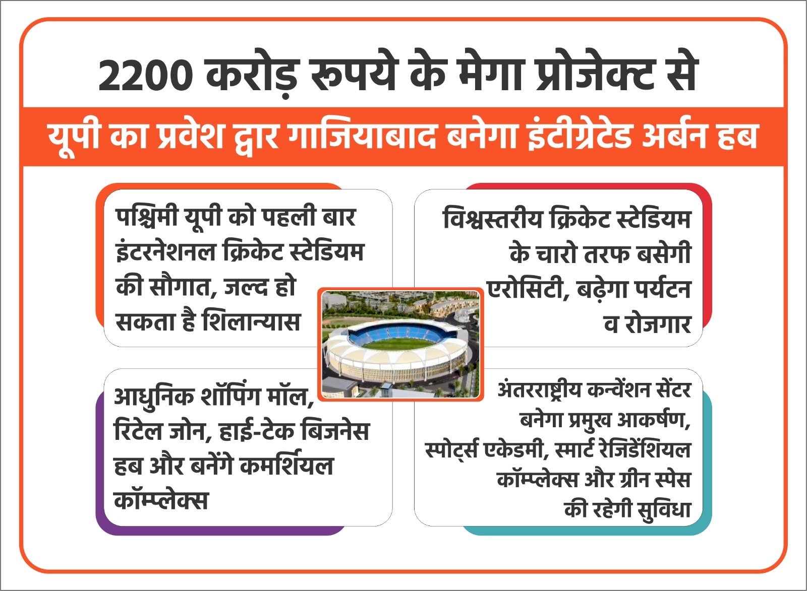 गाजियाबाद विकास प्राधिकरण के वीसी नंद किशोर कलाल ने बताया कि राजनगर एक्सटेंशन (मोर्टी क्षेत्र) में प्रस्तावित इस योजना के तहत 37 एकड़ में करीब 400 करोड़ रुपये की लागत से इंटरनेशनल क्रिकेट स्टेडियम विकसित किया जाएगा, जबकि इसके आसपास 380 एकड़ में लगभग 1800 करोड़ रुपये की लागत से एरोसिटी टाउनशिप बसाई जाएगी। दोनों को मिलाकर एक ऐसा इंटीग्रेटेड अर्बन हब तैयार किया जाएगा, जहां खेल, व्यापार, पर्यटन और आधुनिक जीवनशैली का समेकित विकास होगा।