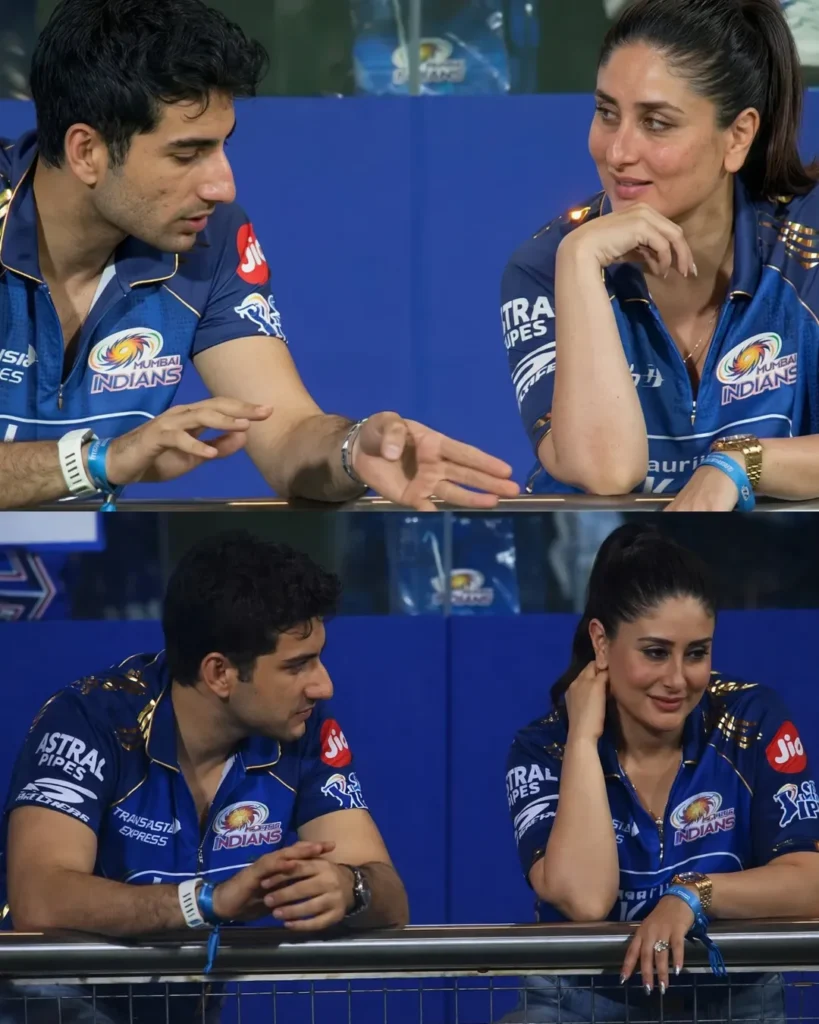 इस मैच के दौरान जहां एक तरफ मैदान पर खिलाड़ियों का शानदार प्रदर्शन देखने को मिला, वहीं दूसरी तरफ कैमरों का फोकस बॉलीवुड सितारों पर भी रहा। खासकर Kareena Kapoor Khan और Ibrahim Ali Khan की मौजूदगी ने सबका ध्यान अपनी ओर खींच लिया।दोनों मुंबई इंडियंस की जर्सी पहने नजर आए और काफी कूल अंदाज में मैच का आनंद लेते दिखे। वायरल हो रही तस्वीरों में साफ दिख रहा है कि करीना और इब्राहिम आपस में बातचीत कर रहे हैं और मैच को लेकर कुछ डिस्कस कर रहे हैं। दोनों के बीच की बॉन्डिंग बहुत ही नैचुरल और सहज नजर आई, जिसे फैंस ने खूब पसंद किया।
