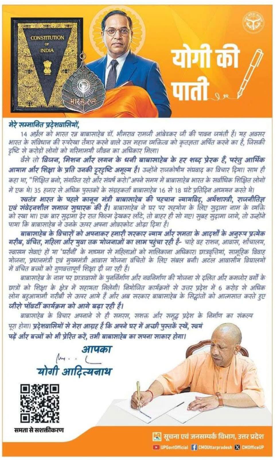 भारत रत्न डॉ. भीमराव रामजी आंबेडकर की 14 अप्रैल को मनाई जाने वाली जयंती के अवसर से पहले यूपी के मुख्यमंत्री योगी आदित्यनाथ ने प्रदेशवासियों को संबोधित करते हुए एक पत्र लिखा है जिसमे उन्होंने बाबा साहब को श्रद्धांजलि अर्पित की और उनके विचारों को अपनाने का संकल्प दोहराया।